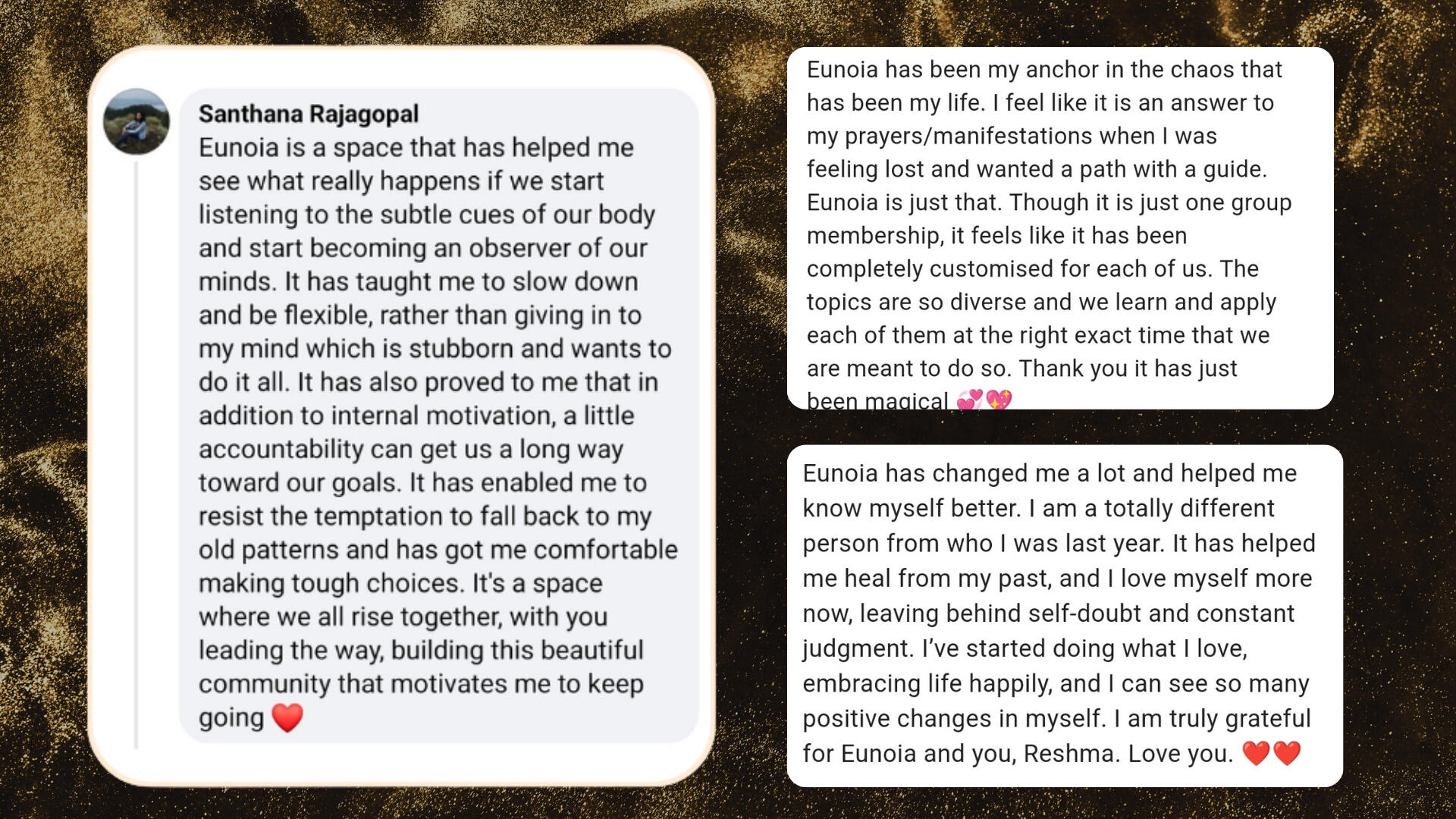Conversations with women who’ve been in Eunoia for months or years, where they share their growth, their breakthroughs, their discomfort, their healing, and all the ways Eunoia has supported them.These are honest, unfiltered, deeply human stories. To understand Eunoia beyond my words… start here ❤️